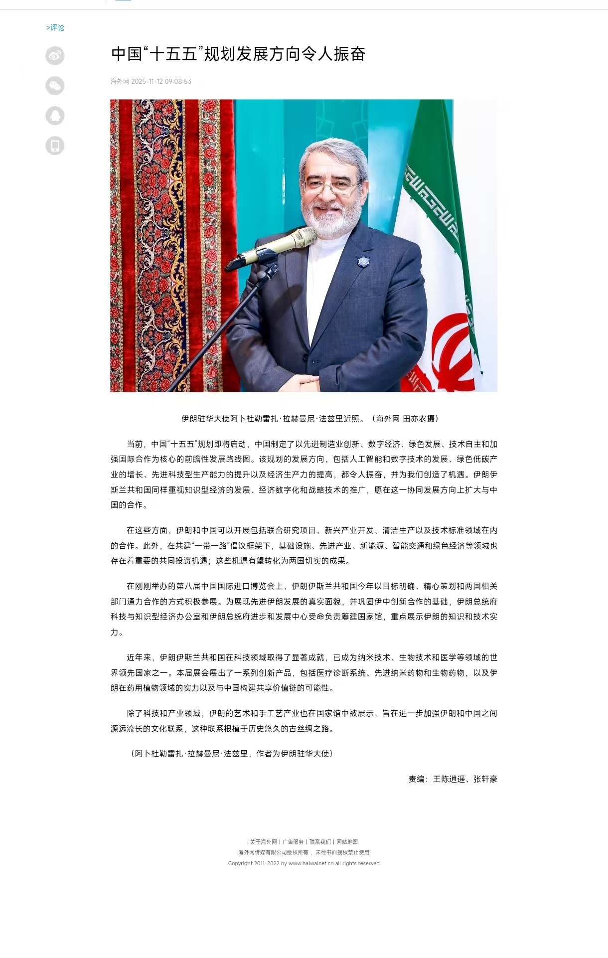 انتشار مقاله سفیر ج.ا.ایران در نشریه مردم چین درخصوص نمایشگاه واردات شانگهای و روابط تجاری...